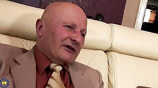 Mature blonde gets sandwiched by two kinky lads after pee bath